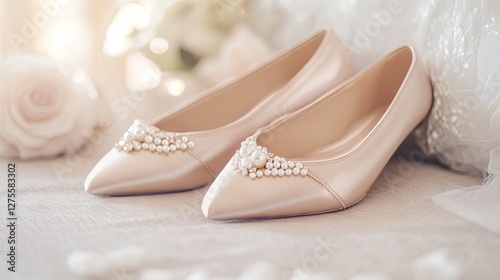 © Pannee, Obraz premium A pair of elegant ballet shoes with pearl embellishments resting on a neutral-toned surface