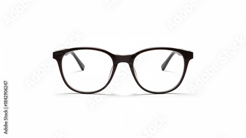 © Lasvu, Fototapeta premium A pair of eyeglasses with black frames and clear lenses placed on a plain white background.