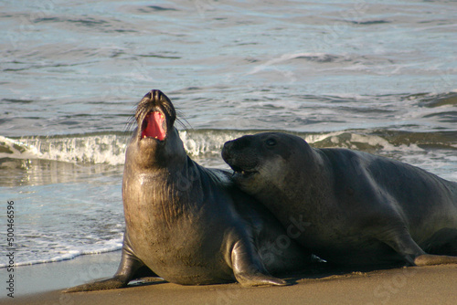 Naklejka premium A Pair of Female Cow Elephant Seal Sea Elephants Fighting on a Sandy Beach