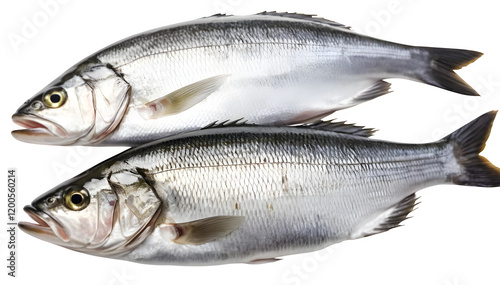 Fototapeta premium A pair of fresh seabass fish in a close-up shot, isolated on a plain white background.