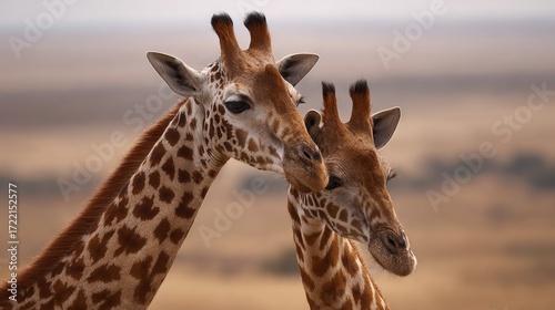 © Anna, Naklejka premium A pair of giraffes grazing on a parched grassland against a clear sky