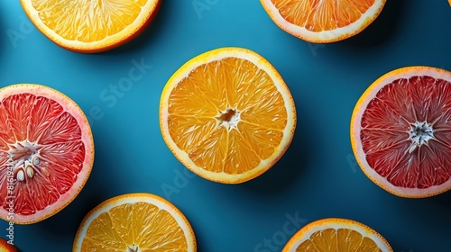 © Anna, Obraz premium A pair of halved grapefruits on a blue background amidst other grapefruits