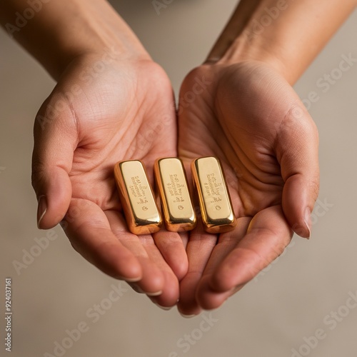 Fototapeta premium A Pair of Hands Delicately Holding Three Golden Bars: A Symbol of Wealth and...