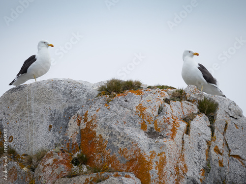 © tloventures, Obraz premium A Pair of Kelp Gulls standing and facing each other while on a rock face with orange and gold lichen growing on it.