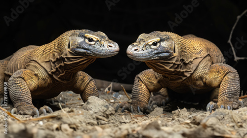 Obraz premium A pair of Komodo dragons. Komodo in a Natural Habitat Adventure. Close-up photo.