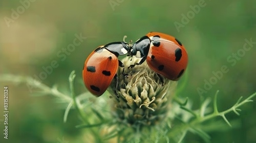 Fototapeta premium A pair of ladybugs resting on a lush green foliage atop a field