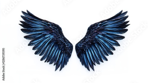 © sukarman, Obraz premium A pair of large, detailed wings, spread wide. The wings are predominantly blue and black, with a mix of shades and gradations. The feathers are meticulously depicted, showing texture and depth.