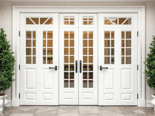 © Atittaya, Fototapeta premium A pair of large glass doors in a crisp white finish adorned with ornate hardware, glass doors, modern entrance, contemporary style