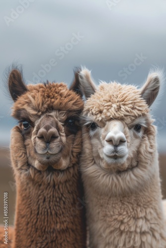 © Ева Поликарпова, Obraz premium A pair of llamas standing side by side, possibly in a farm or zoo setting