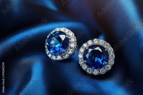 Fototapeta premium A pair of luxurious blue sapphire earrings encrusted with diamonds, placed on a deep navy-blue silk fabric
