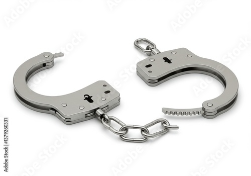 © Ms Vector, Obraz premium A pair of open metal handcuffs connected by a chain laying on a white surface in a studio shot