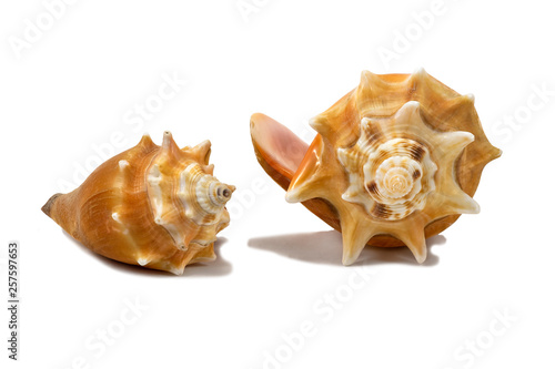© Вячеслав Степанов, Obraz premium A pair of orange colored seashells isolated on a white background closeup