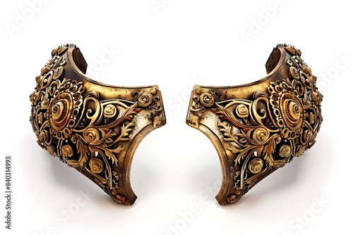 © Ratchadaporn, Obraz premium A pair of ornate decorative cuffs showcasing intricate metallic braided patterns and embellishments on a pure white background