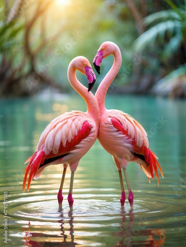 Fototapeta premium A pair of pink flamingos stand gracefully in calm water, surrounded by lush greenery, symbolizing love and harmony in nature.