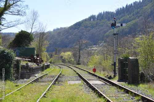 Fototapeta premium a pair of railway lines heading towards Llangollen station with signals on...