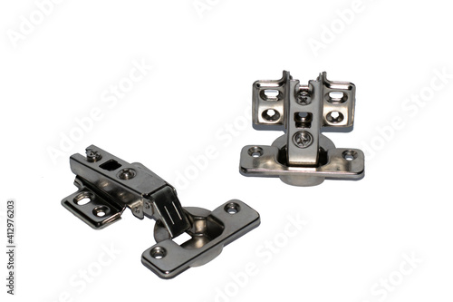 © Ryzen0827, Obraz premium A pair of stainless steel concealed hinges for cabinet doors in a white background