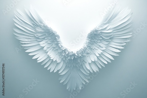 © AURA COLLECTIONS, Obraz premium A pair of stylized angel wings made from layered white materials against a light background.