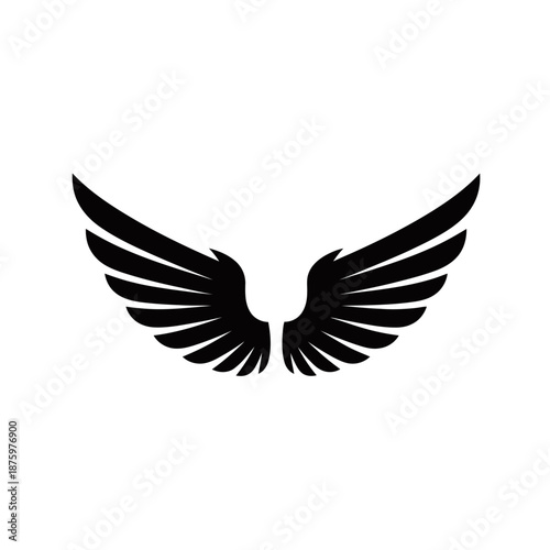 Obraz premium A pair of stylized black wings with multiple feathers spread wide, isolated on a clean white background.