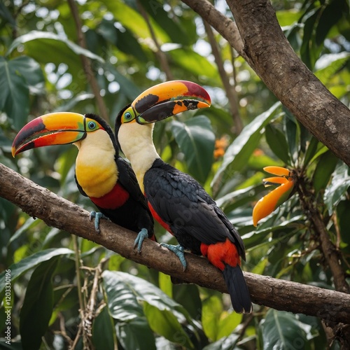 © Muhammad, Naklejka premium A pair of toucans sharing a fruit on a sunny day.
