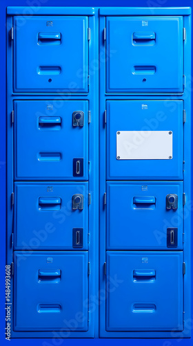 Fototapeta premium A pair of vibrant blue metal lockers, each with six compartments and small...