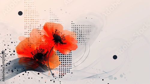 © Sonya, Fototapeta premium A pair of vibrant orange blossoms perched atop a monochromatic white-black backdrop, alongside a contrasting black-white polka-dotted wall
