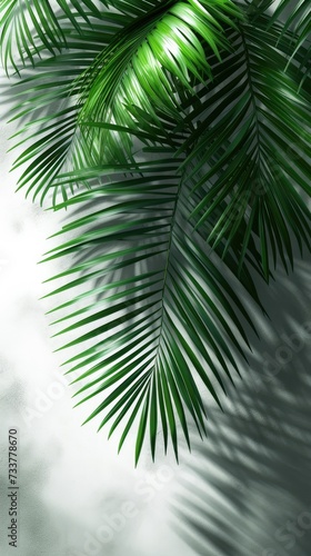 Fototapeta premium A palm leaves against grey background, in the style of light white and light...