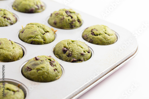 Obraz premium A Pan of a Dozen Spinach Green Chocolate Chip Mini Muffins