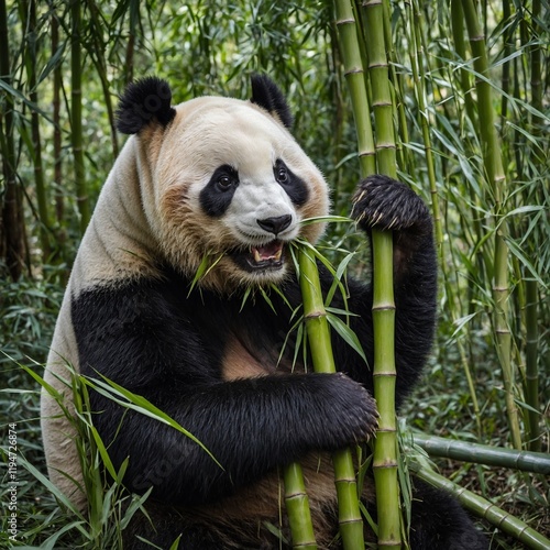 © Kashif, Obraz premium A panda bear eating bamboo in a forest with tall, swaying bamboo stalks.