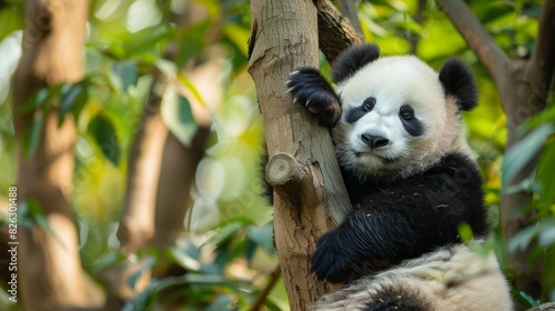 © Joyce, Obraz premium A panda bear on tree in wild forest.