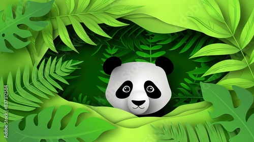 Fototapeta premium A panda bear peeks out from lush green leaves with its panda face in the center