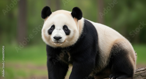 © Mr, Fototapeta premium A panda bear sitting on a log in a forest looking at the camera with a gentle expression