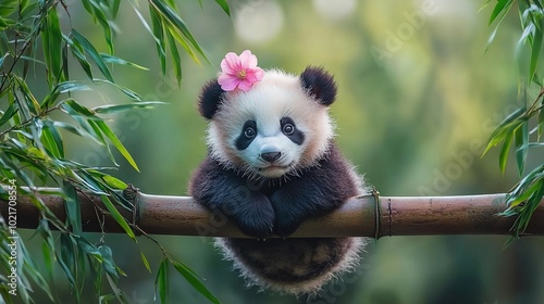 Fototapeta premium A panda bear with a pink flower on its head is sitting on a bamboo branch, looking at the camera