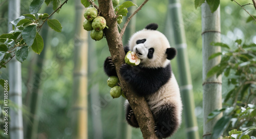 © wodeol99, Obraz premium A panda cub happily eats guava while climbing tree
