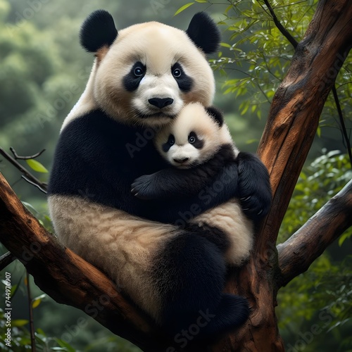 Obraz premium A panda is hugging its cub on a tree branch