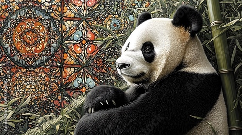 Fototapeta premium A panda leaning against bamboo, surrounded by floating geometric shapes in...
