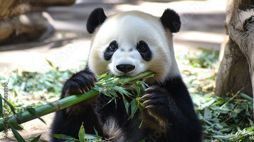 © That, Obraz premium A panda munching on a thick stalk of bamboo in a tranquil sanctuary.
