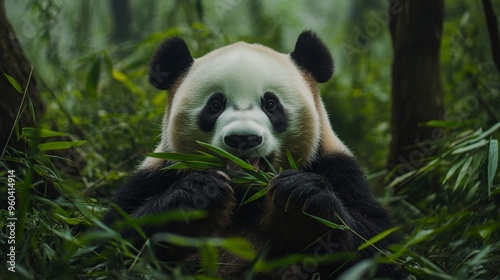 © Matthew, Fototapeta premium A panda munching on bamboo in a lush, green forest setting.