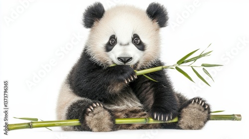 © imlane, Naklejka premium A panda sitting while eating bamboo, looking adorable, white background
