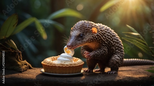 © Tina, Obraz premium A pangolin curiously approaches a dessert tart with whipped cream in a lush setting.