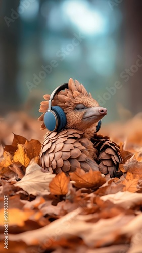 © Food and drink, Obraz premium A pangolin enjoying music with tiny headphones while lounging on fallen leaves.