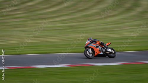 Fototapeta premium A panning shot of a racing bike cornering as it circuits a track.
