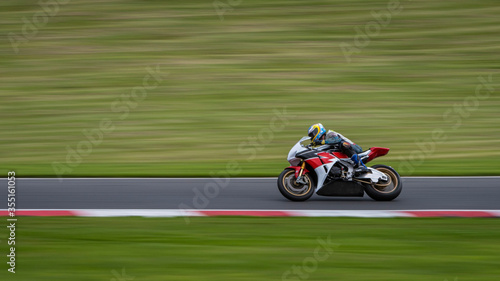 © SnapstitchPhoto, Fototapeta premium A panning shot of a white and red racing bike cornering on a track