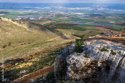 © elenarostunova, Fototapeta premium A panorama from Mount Gilboa Israel featuring pines, flora, the valley, and the Jordanian mountains, with clouds overhead and farmland stretching below.