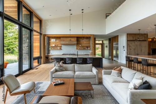 © Andrei, Fototapeta premium A panorama of a spacious open-plan home with seamless transitions between living areas, dining areas, and kitchen spaces, creating a sense of flow and connection