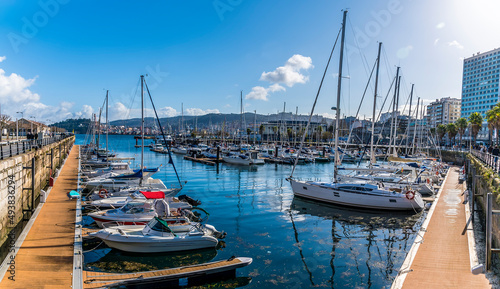 © Nicola, Fototapeta premium A panorama view across the marina in Vigo, Spain on a spring day