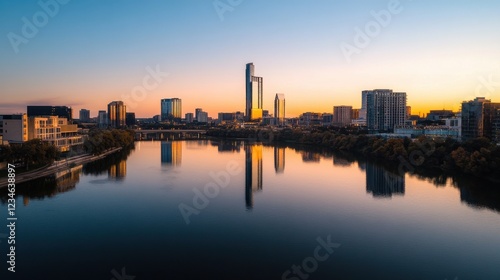 Naklejka premium A panoramic city skyline reflecting in a calm river at dusk.