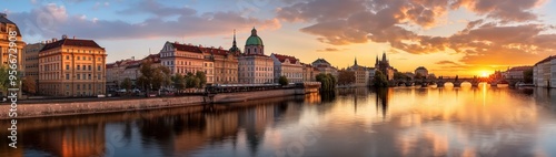 Naklejka premium A panoramic image showcasing historic European buildings along a river at sunset, featuring a blend of architectural beauty and natural scenery in a picturesque setting.