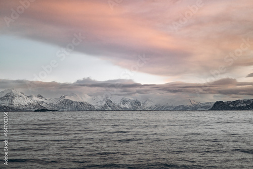 Naklejka premium A panoramic landscape featuring a vast, dark sea under a dramatic sky with a large, sweeping cloud formation and a distant range of snow-capped mountains.
