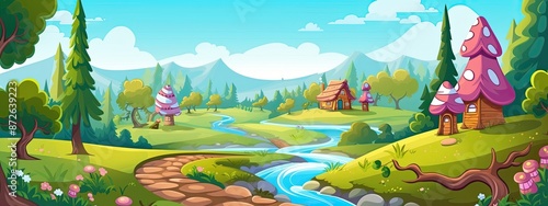 © Pihta, Fototapeta premium A panoramic landscape of a candy country with gingerbread houses and river. Cartoon illustration.
