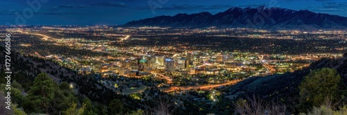 Obraz premium A panoramic nighttime view of a vibrant city nestled in a valley, illuminated...